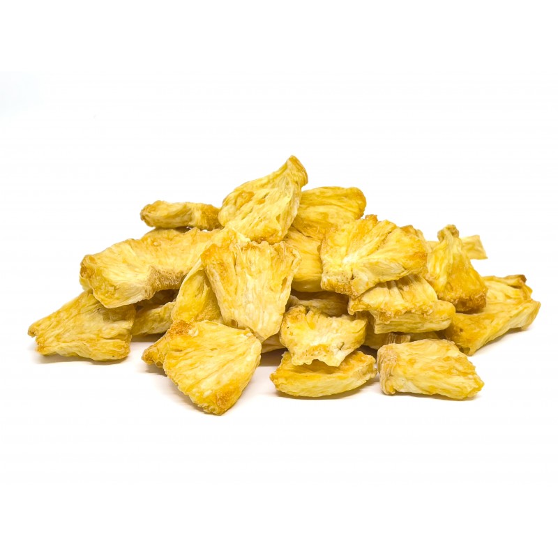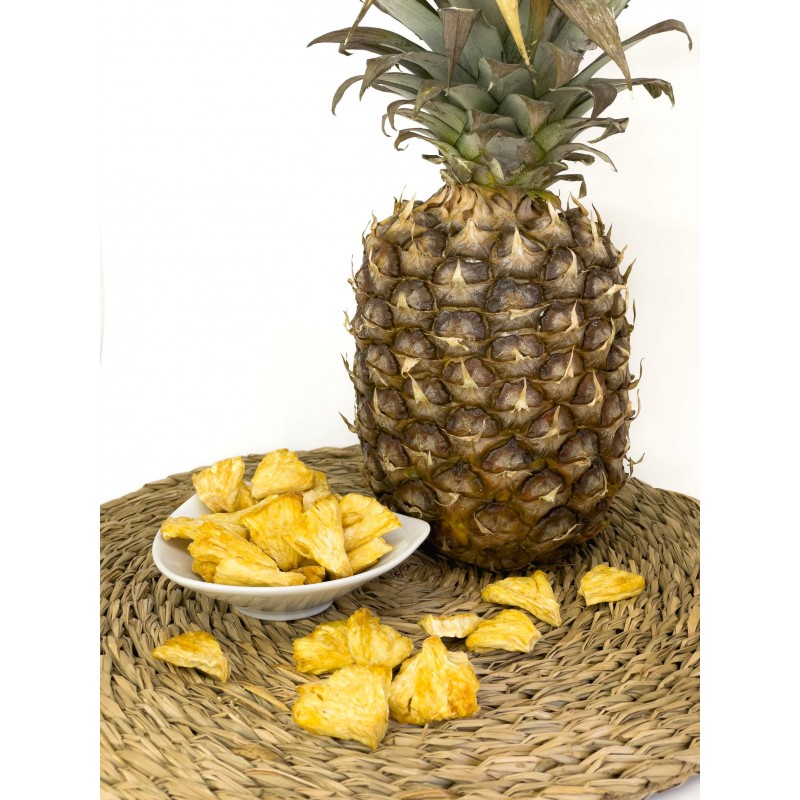 Dehydrated pineapple in pieces, a snack free of added sugar, without colorants, flavors or preservatives. It is a food that largely maintains the properties of fresh fruit, becoming a healthy snack and a new way of consuming fruit and enjoying its benefits.